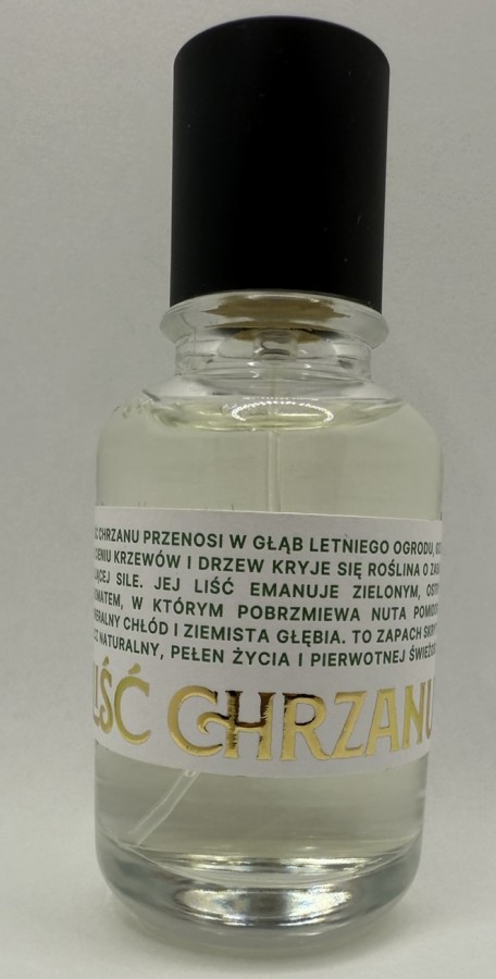 Liść Chrzanu powstał z przypadku; jego nutę dodawaliśmy do wielu zapachów, np. do Pana Pomidora. W końcu nadeszła pora na występ solo. Liść Chrzanu to zapach ukryty w cieniu ogrodu – zielony, wilgotny, ostry jak oddech ziemi po deszczu. Chrzan rośnie cicho pod liśćmi, niepozorny, ale jego aromat zdradza obecność, której nie da się pomylić.